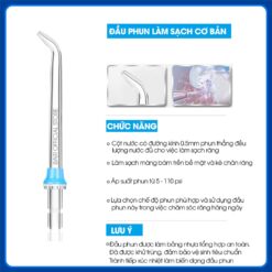 – Hai đầu xịt tiêu chuẩn, dành cho mọi đối tượng, dùng để vệ sinh kẽ răng, vùng răng trong cùng (lực xịt mạnh nhất làm sạch tối ưu)